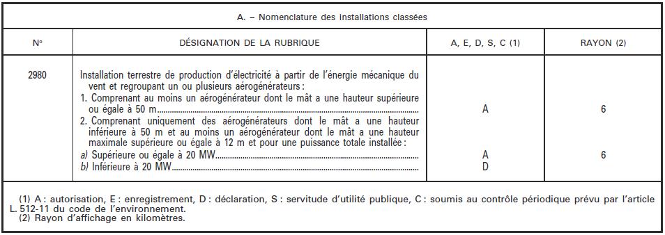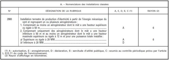 L’article 90 de la loi avait prévu le classement des éoliennes dans le régime des installations classées soumises à autorisation. Deux décrets du 23 août 2011 mettent ce texte en application.