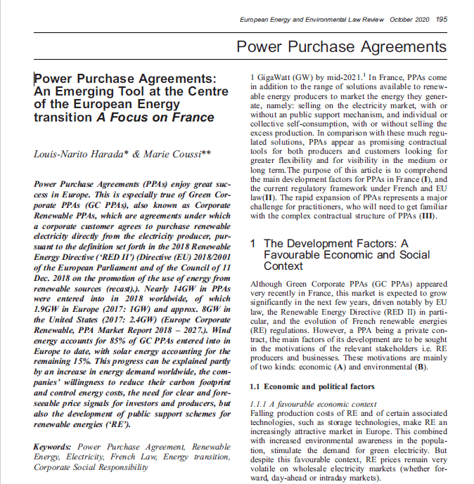 Une fois n’est pas coutume, let’s write in English to share with you our article in English on the emergence of Green corporate PPAs in Europe and France. It was written with Marie Coussi and published in the October 2020 issue of the European Energy and Environmental Law Review. Any question on this, please get in touch!